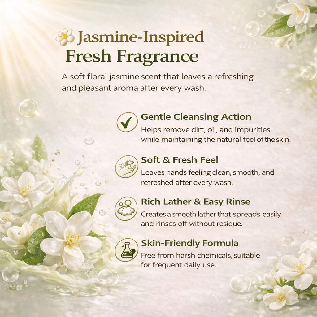 - Jasmine-Inspired Fresh Fragrance: A soft floral jasmine scent that leaves a refreshing and pleasant aroma after every wash.