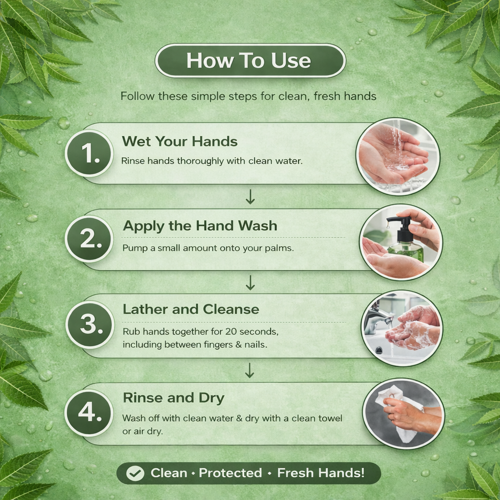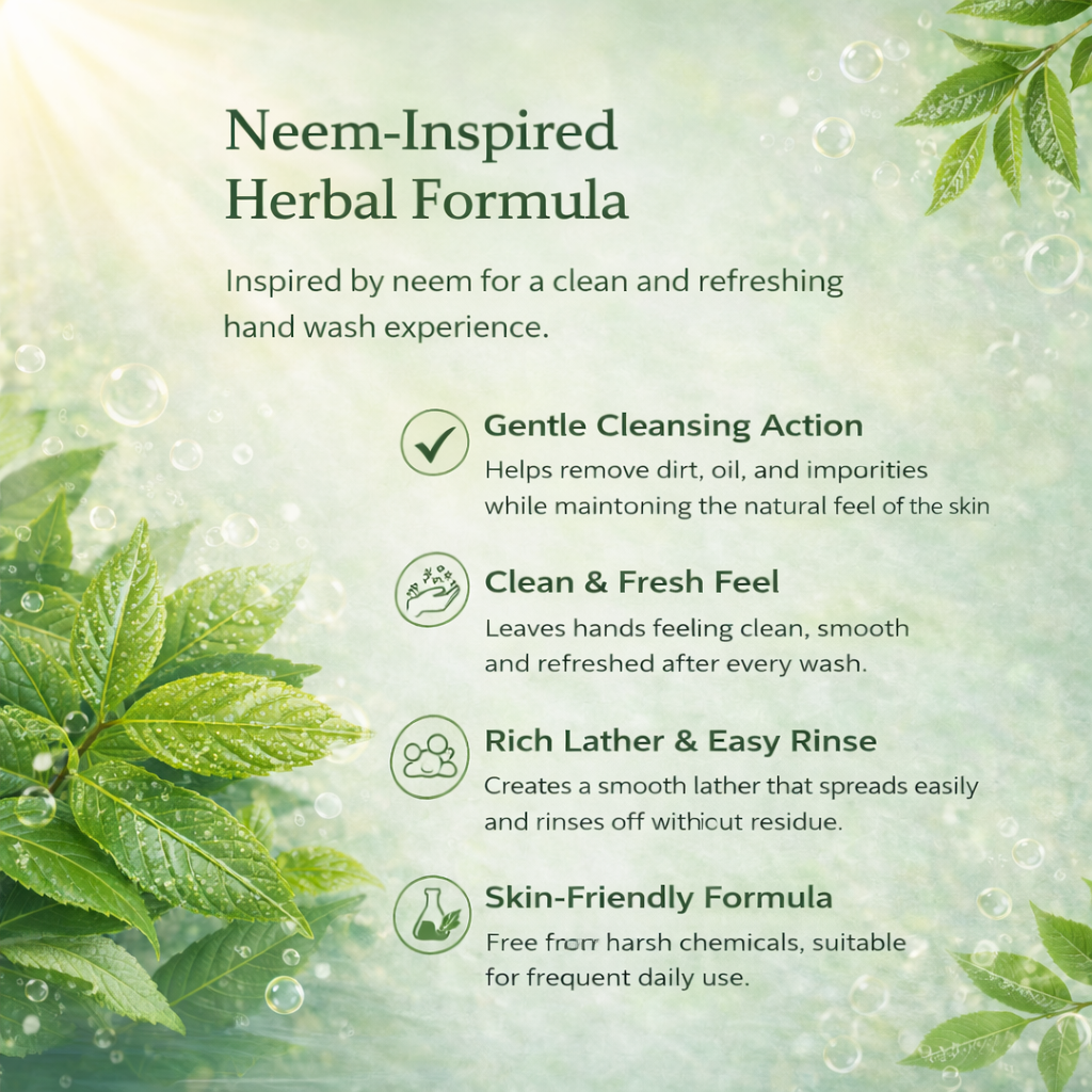 - Neem-Inspired Herbal Formula: Inspired by neem for a clean and refreshing hand wash experience.